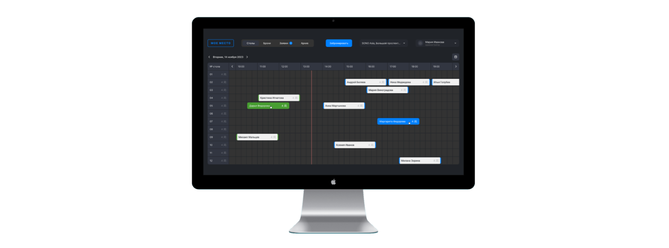Вместо постоянного пересчёта свободных столов - визуальная карта загрузки зала. Каждый стол отображается как временная шкала. Одним кликом можно подтвердить заявку, внести комментарий ("празднует день рождения"), отметить приход гостя или отменить бронь. Фильтры по датам, статусам и конкретным столам упрощают поиск. А архив хранит историю всех визитов - полезно для постоянных клиентов, которые ценят, когда их помнят.