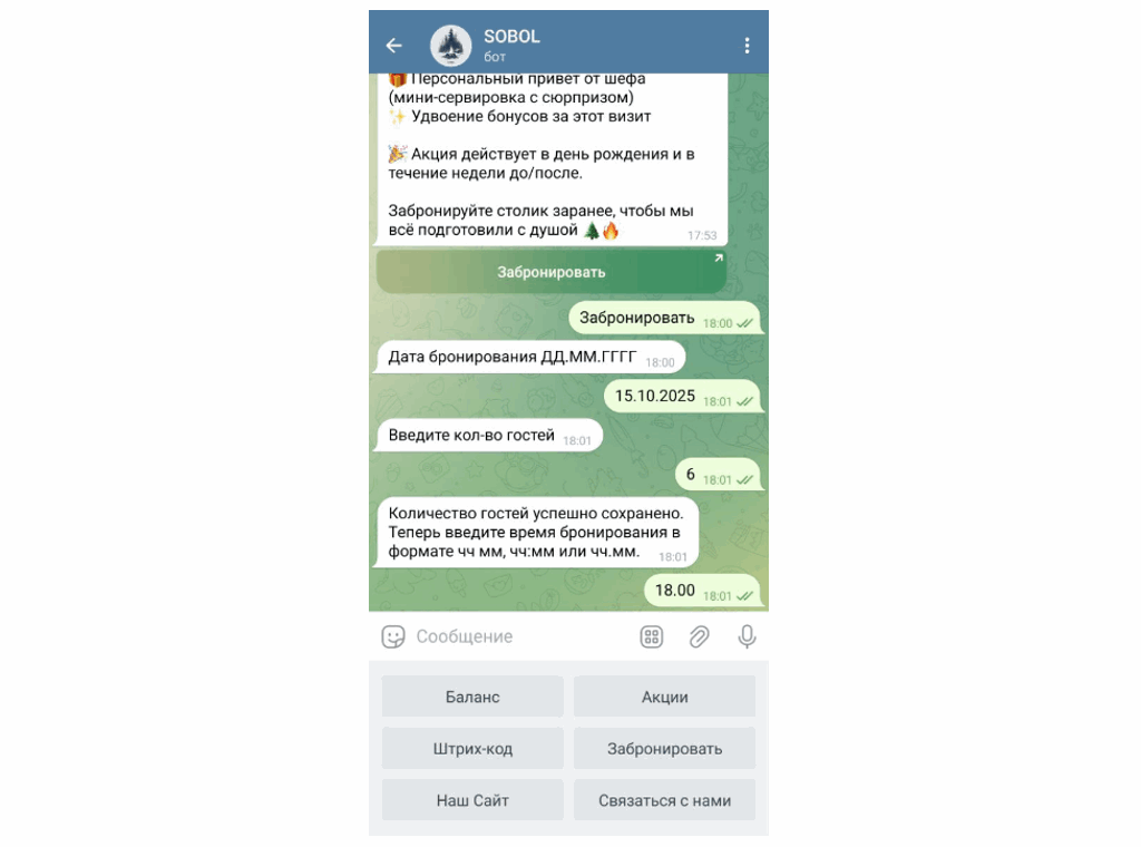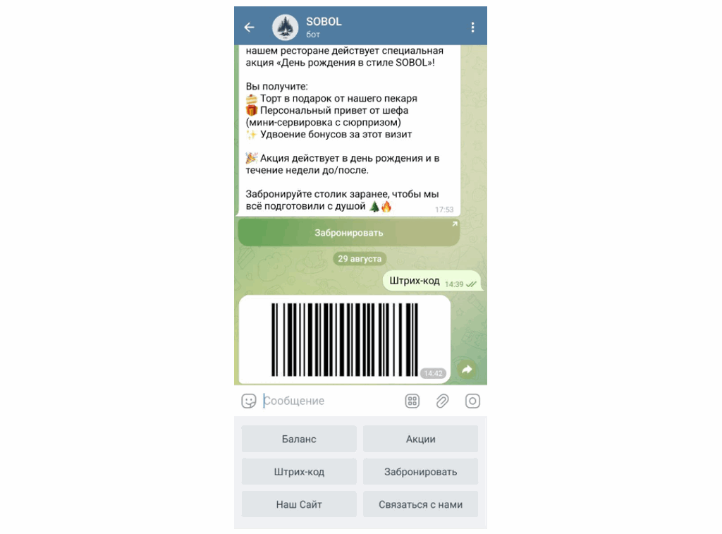 - Системные кнопки. Превращают бота в удобный сервис для клиентов. Например, «Баланс» показывает количество бонусов или кешбэка, «Моя карта» предоставляет доступ к штрих-коду или QR-коду карты лояльности, «Акции» открывает актуальные предложения и рассылки.