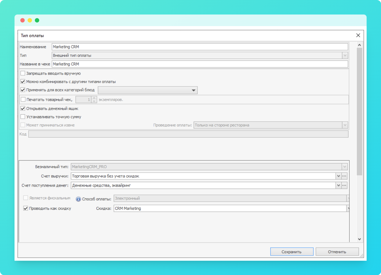 Завести новый внешний тип оплаты под названием «Marketing CRM»;